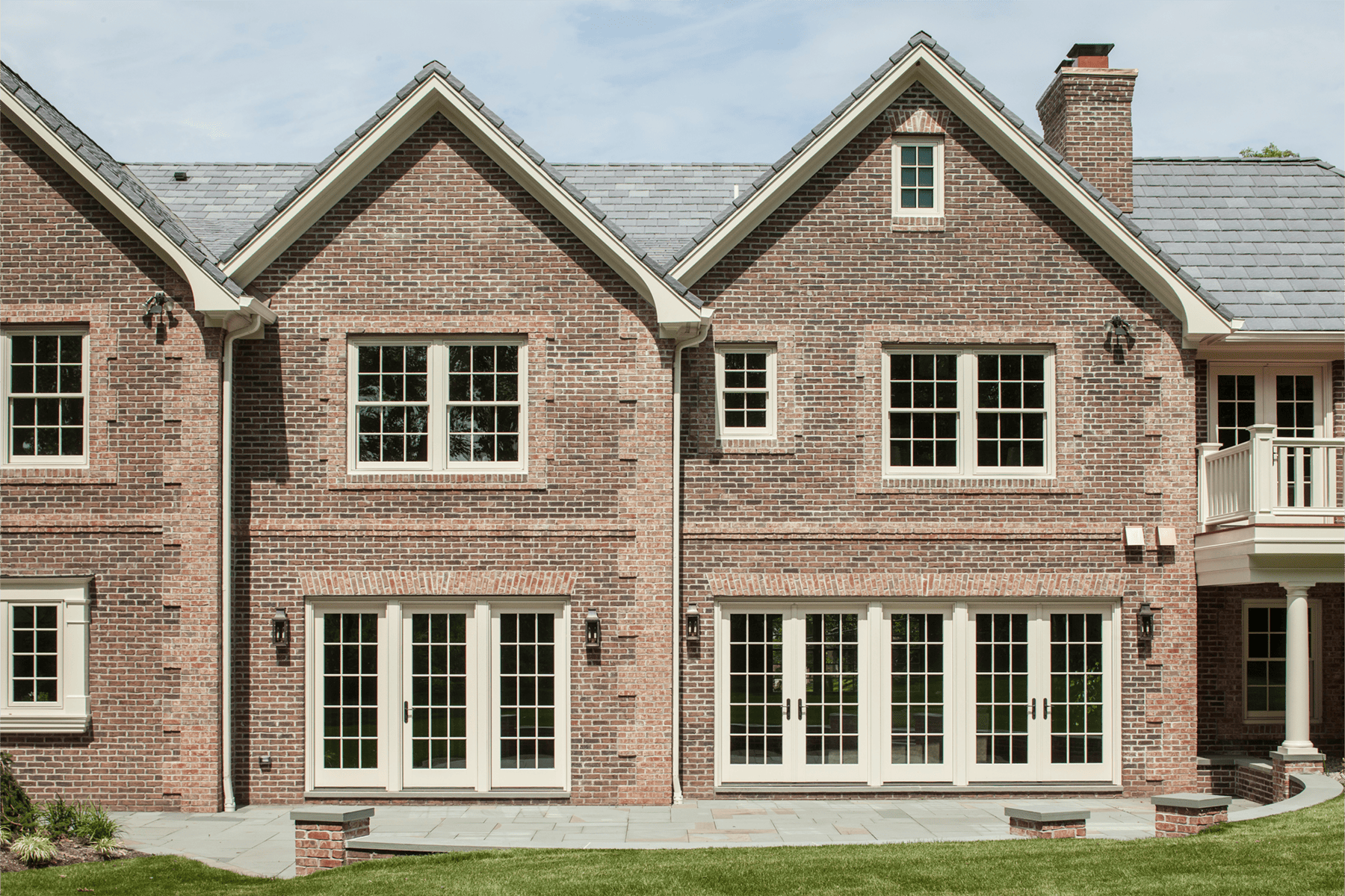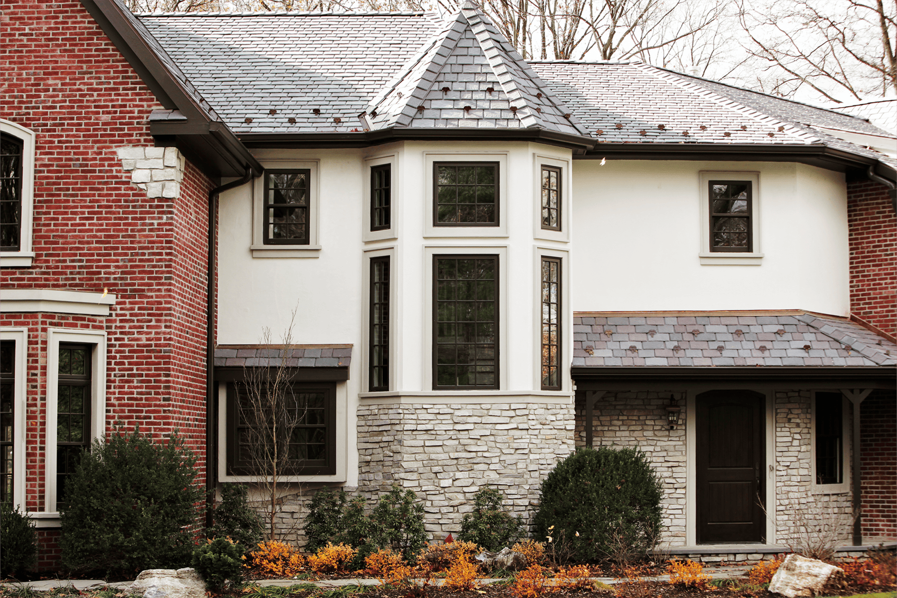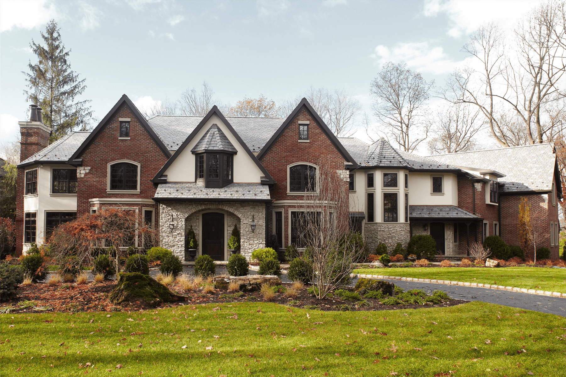 An English Country House showcasing extensive decorative brickwork and a Davinci slate roof. Inside, traditional custom millwork and cabinetry