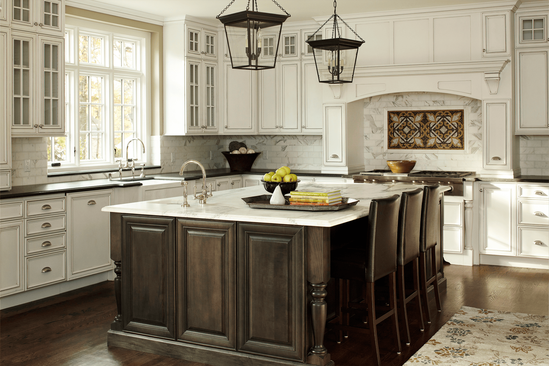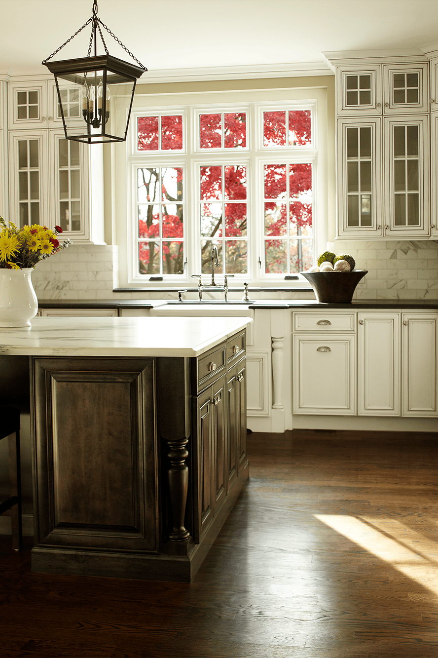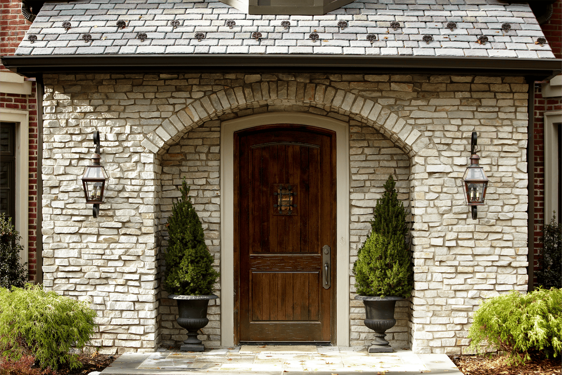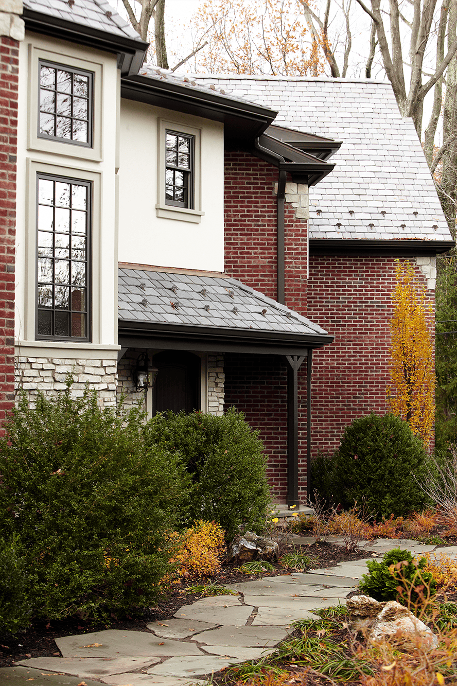 An English Country House showcasing extensive decorative brickwork and a Davinci slate roof. Inside, traditional custom millwork and cabinetry