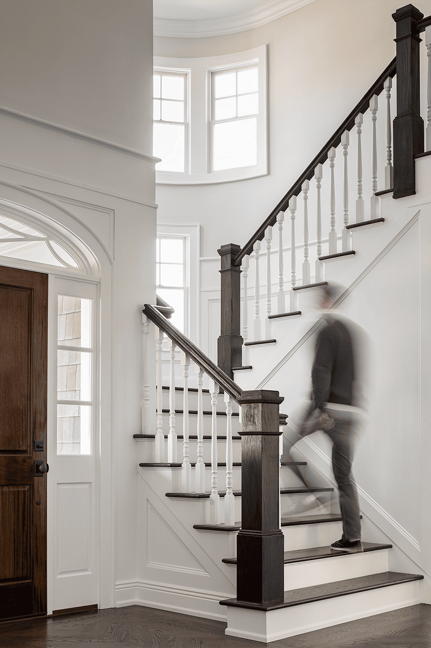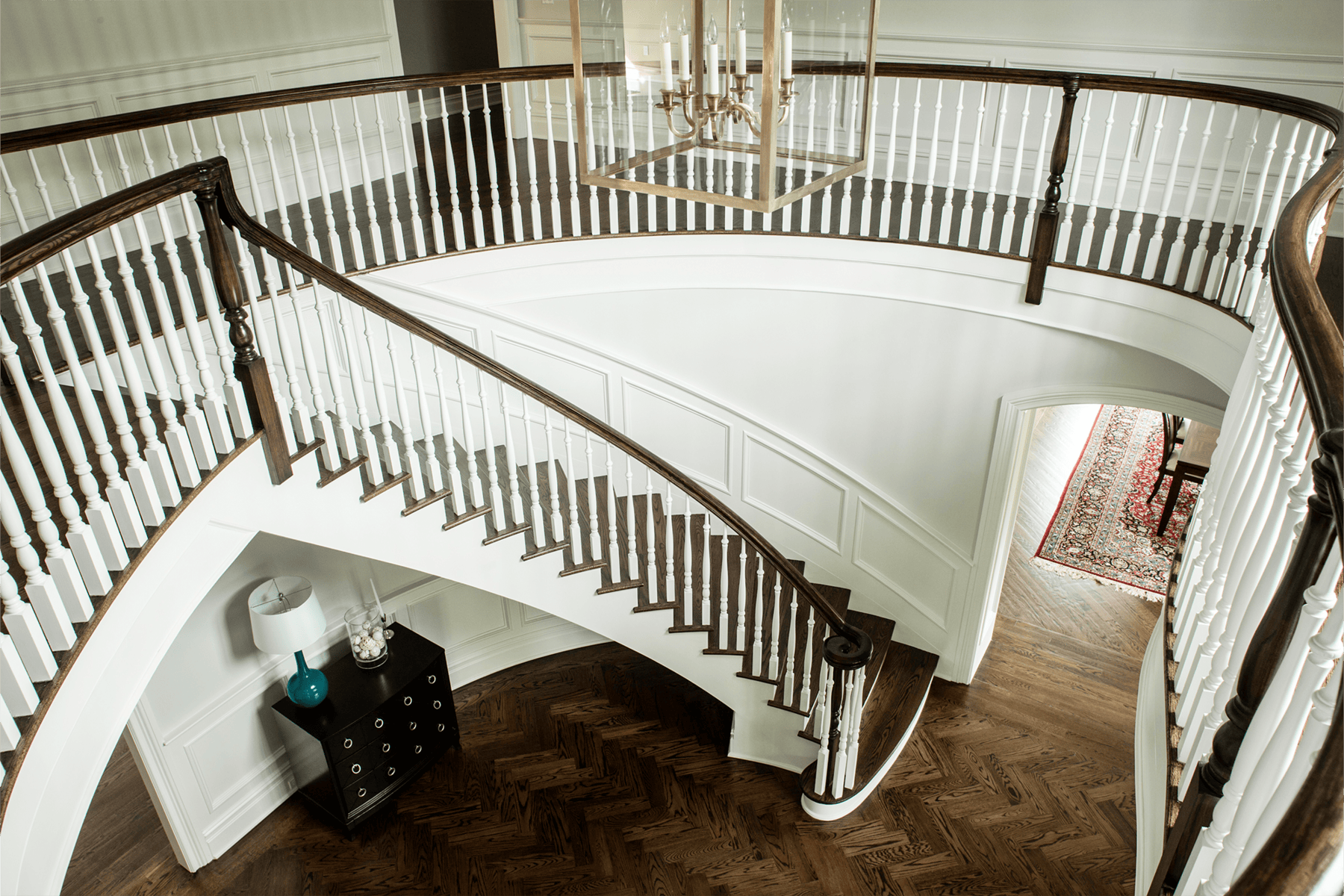 enhance the splendid two-story foyer with a sweeping curved staircase. Architecture by Dubinett Architects. Interior Design by ML Interiors.