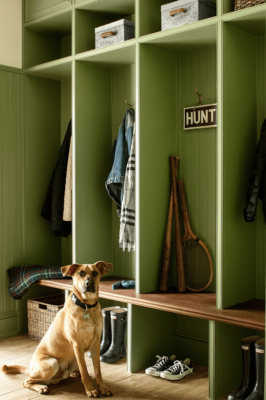A modern farmhouse elevated by white clapboard, painted brick and rough-hewn wood beams. The interiors combine custom cabinetry with white oak