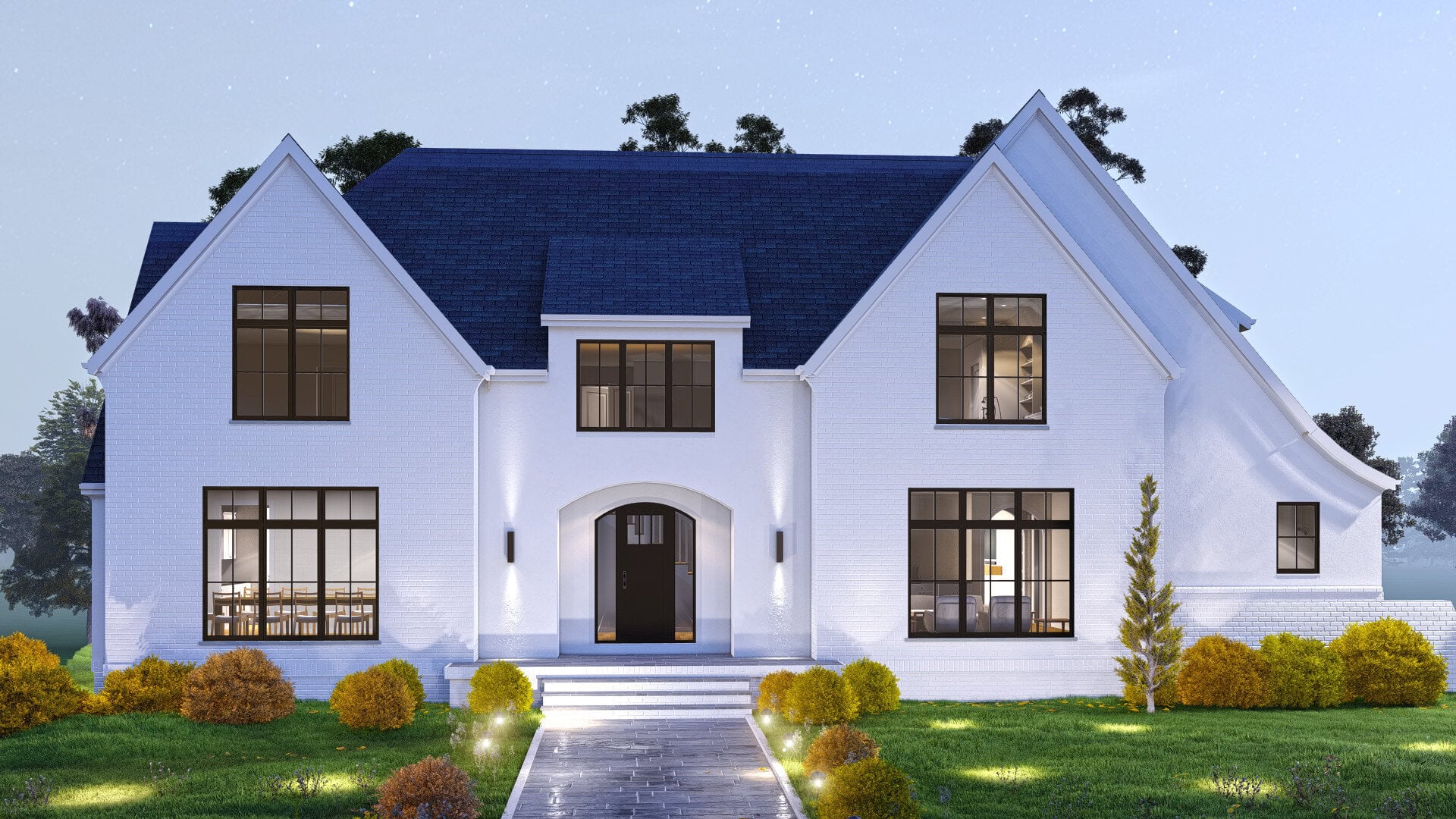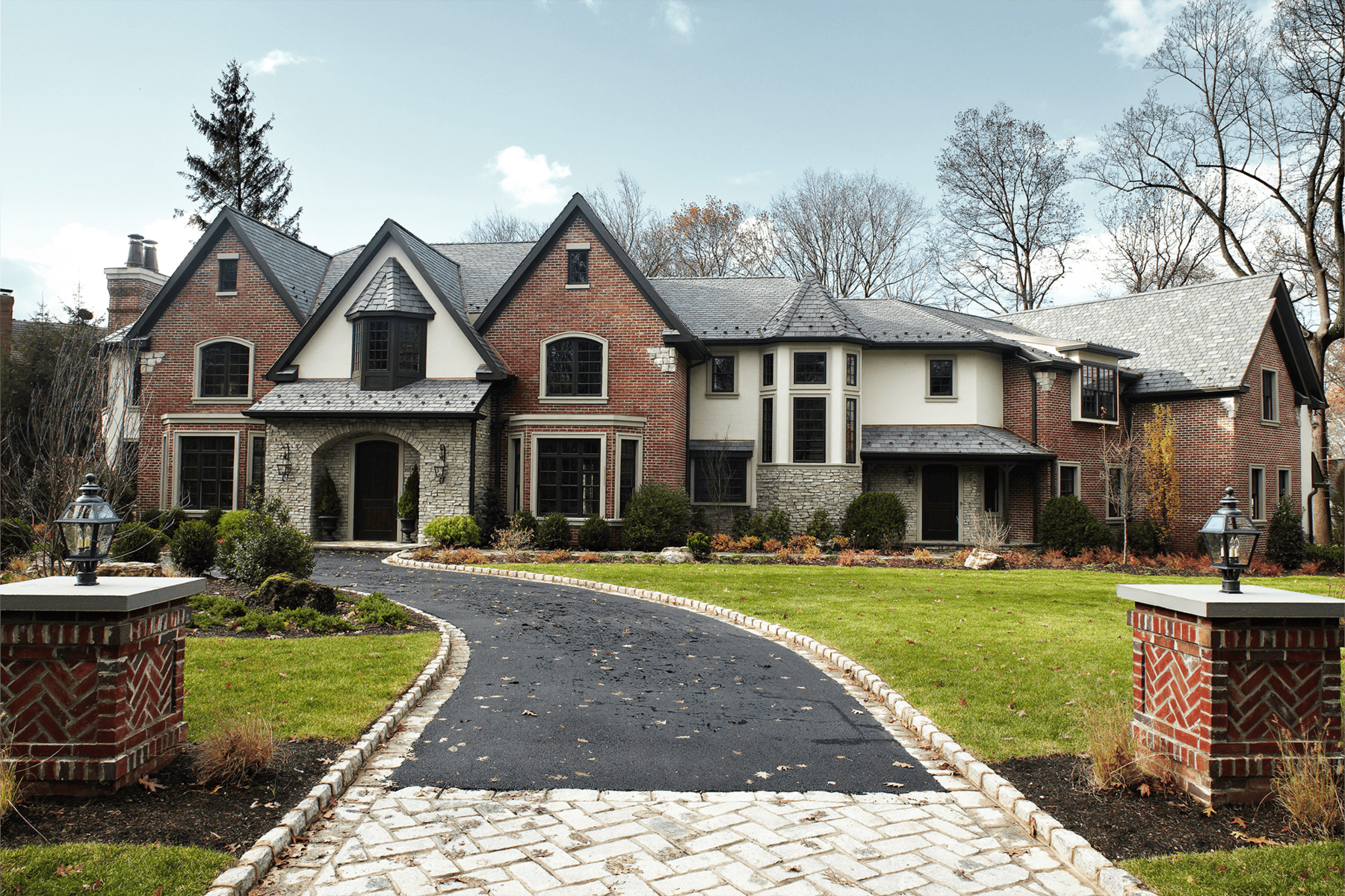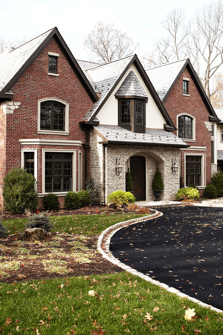 A luxurious Modern Tudor defined by brick, stucco, and stone exteriors, with a Davinci slate roof. This 9,000-square-foot home offers warm, inviting