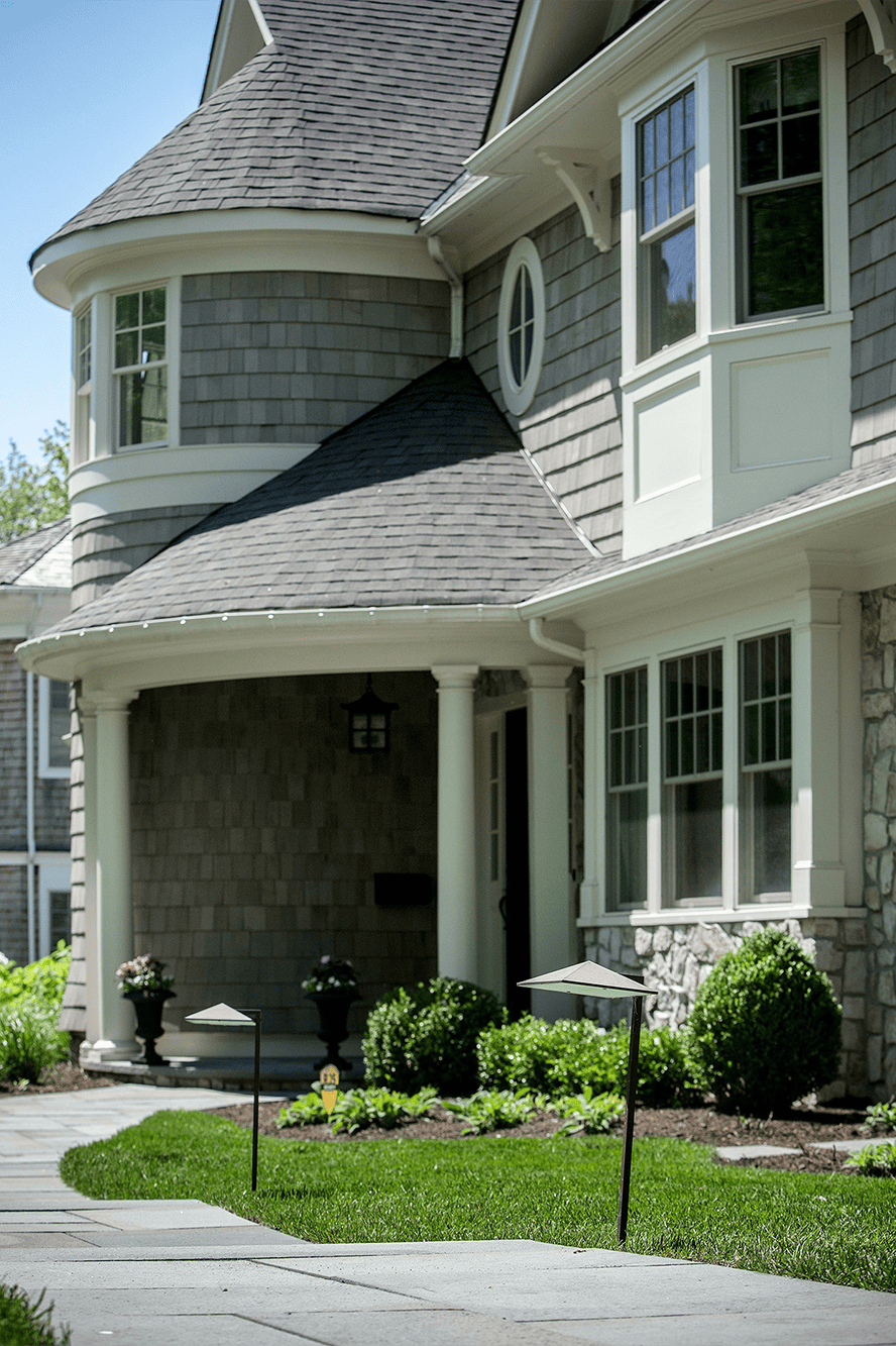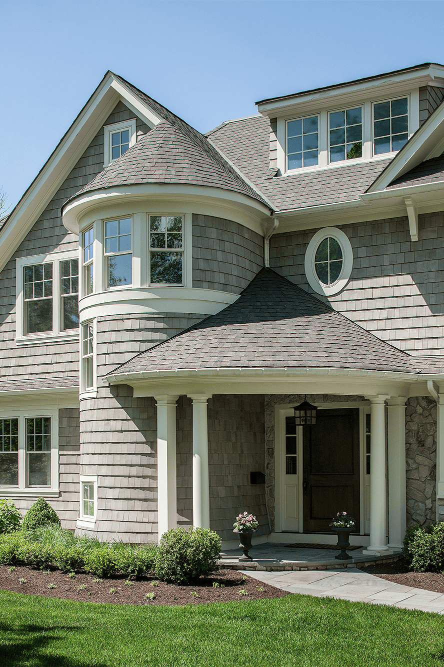 A Hamptons-inspired Shingle Style home with distinctive rooflines, a turreted stairwell and a curved entryway. The 6,500-square-foot layout